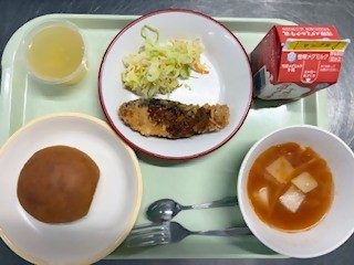 3月6日(金) 2026/03/09 バンズパン 鮭フライ ゆで野菜 ヌードル入りトマトスープ りんごゼリー 牛乳 3月5日(木) 2026/03/05 【食べよう野菜350】 ごはん 野菜120gのトッポギ入りタッカルビ わかめスープ はっさく 牛乳 3月4日(水) 2026/03/04 ごはん 豆腐ハンバーグ 野菜のみそドレッシングサラダ にんじんポタージュ 牛乳