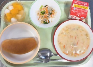 3月11日(水) 2026/03/11 黒砂糖コッペパン キャベツとコーンのクリームスープ 野菜のうま塩だれ 白玉フルーツミックス 牛乳 3月10日(火) 2026/03/10 ごはん 豆腐の中華煮 春雨スープ はっさく 牛乳 3月9日(月) 2026/03/10 【リクエスト給食】 しょうゆラーメン 大豆のサラダ さつまいもドーナツ 牛乳